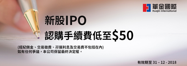 ● 即日起客戶透過華金證券(國際) 有限公司 (“華金國際”) 進行認購任何港股新股均可獲享手續費低至$50的優惠(經紀佣金、交易徵費、孖展利息及交易費不包括在豁免範圍內)。